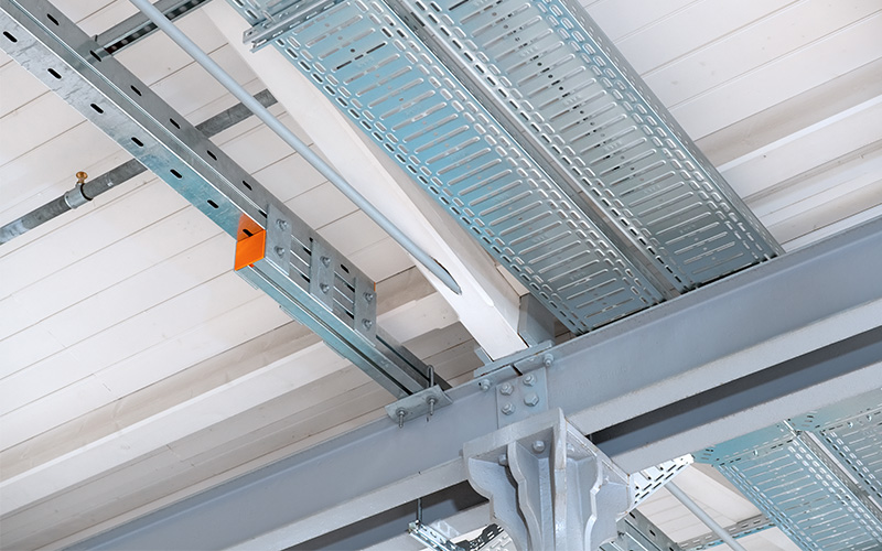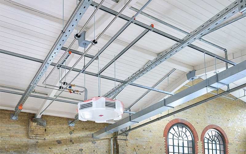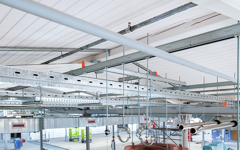 En raison de la capacité de charge limitée du toit, MÜPRO a résolu le problème de fixation des installations de conduites à l'aide d'une grille de plafond composée de rails fixés aux poutres en acier.